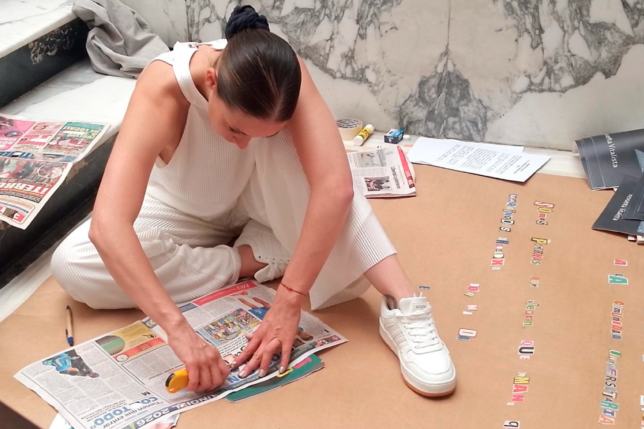 Vestida de modo especial, a fin de enfatizar que su cuerpo era solo un medio de creación y no el foco central de la obra, Machado cortó y pegó las letras que conformaron las 3.053 del Manifiesto DISCA. El collage tipográfico es una técnica que ha sido utilizada históricamente para crear mensajes anónimos y fragmentados, lo que encaja con la realidad de muchos estudiantes con discapacidades, cuyas voces a menudo quedan dispersas o diluidas en el entorno universitario.