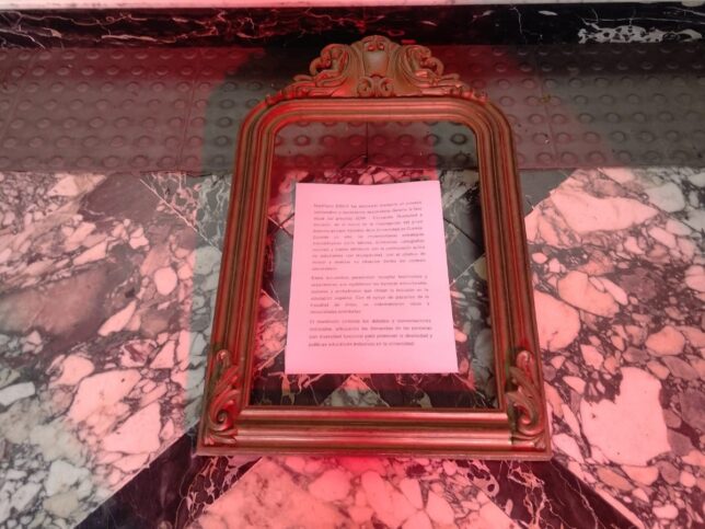 La propuesta fue diseñada para involucrar a aquellos que transiten y circundan el espacio. Vale anotar que, al pie de la escalera de la Biblioteca de las Artes, se colocó un reflector que iluminó un cuadro donde se encontraba se sustentó la acción performática.