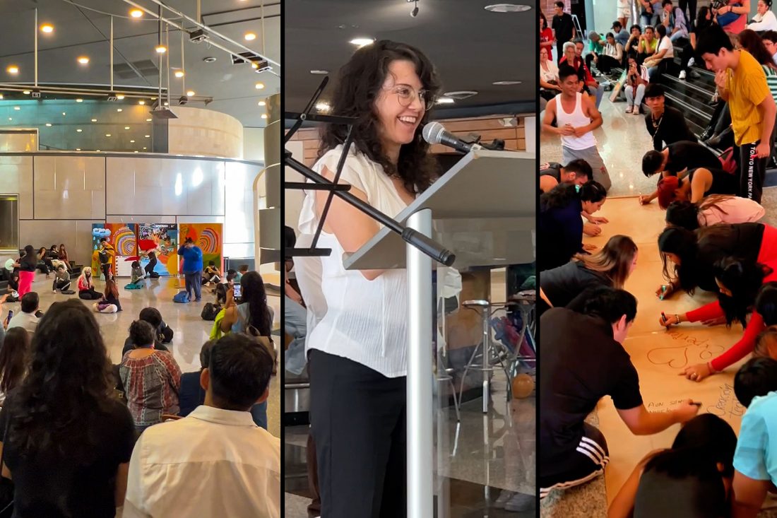 Cabe anotar que, de la nueva carrera de la Escuela de Literatura se mostró durante la jornada –y también como resultados del proceso formativo– un mural interactivo, donde los presentes podían dejar mensajes. Antes, debían pasar por una estación de globos que en las manos de un grupo de alumnas adquirieron múltiples formas, una antesala donde se retiraban, además, los postis que debían adherirse al mural con aquello que espontáneamente se quería transmitir.