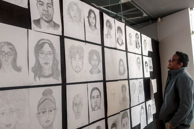 Ramírez está junto a la profesora Silvia Quezada a cargo de las asignaturas de Práctica Disciplinar y Dibujo. Ambos docentes acompañaron a InfoUArtes en el recorrido por la exposición. “Es una muestra de procesos más que de productos terminados”, anotó Quezada mientras señalaba a la entrada de la sala, y del lado izquierdo, la pared que recogió los autorretratos que realizaron los alumnos. Se trató de un antes y un después, de cómo se vieron al llegar y los cambios que fueron dando.