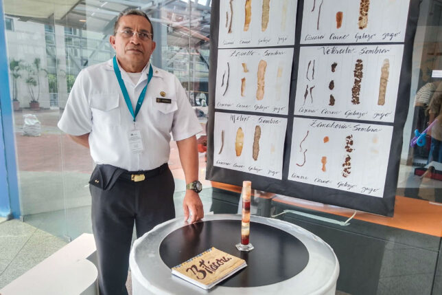 Igualmente, Osorio expuso al Sol durante tres y cuatro días las cáscaras de las frutas y hortalizas. “Se secaron y torcieron, parecían quebrarse. La pulpa se secó totalmente y formó especies de láminas; los gabazos recibieron la arremetida de moscas y otros insectos y el jugo prácticamente desapareció. Estos mismos productos los llevé a la sombra por seis y siete días”, reveló, mostrando sus resultados en cartulina y en un tubo de ensayo. De la cáscara del melón, por ejemplo, hizo la pasta de la bitácora donde detalló el paso a paso de su experimentación.
