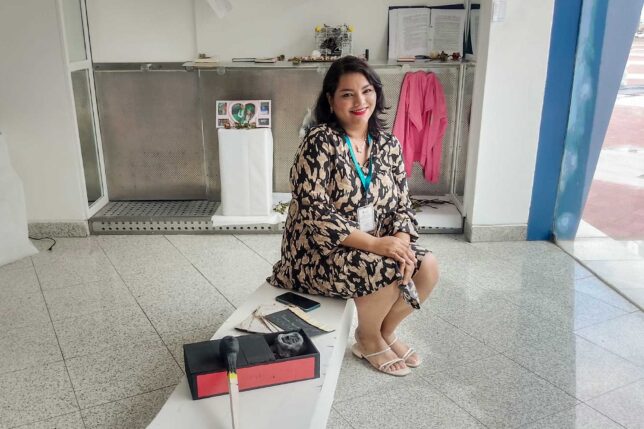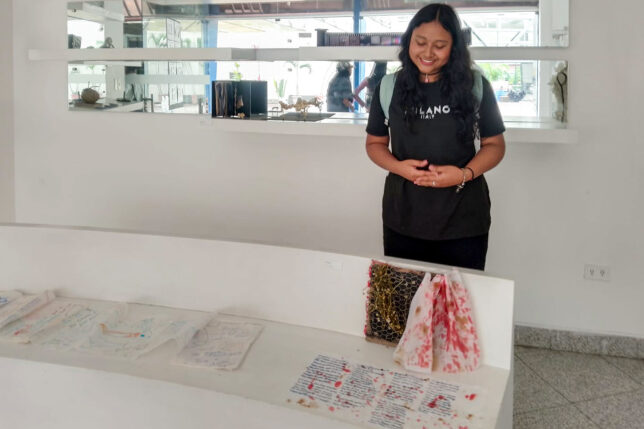 En el espacio, ahora concebido como una sala de taller, se presentaron alrededor de 25 propuestas elaboradas en materiales no convencionales para la creación artística. “Detrás de todo lo que vemos aquí, se han dado procesos en que los estudiantes han tenido que salirse de esa zona de confort para poder manipular otros materiales y tener nuevas visualidades con las que pueden discursar más adelante en la carrera”, expresó.