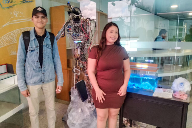 Jeremy García participó en la muestra de resultados de Artes Visuales con una obra que denominó “Descomposición poshumanista”, visibilizada a través de un robot al que bautizó El Errante. “Es una persona del futuro que pretende cambiar todas las piezas de su cuerpo para ser mejor que los demás y prevalecer más tiempo en el mundo. Utilicé materiales reciclados de computadoras, varillas metálicas, cables, todo lo que hallé en mi casa. Lo armé pensando en el intento de muchos por ser superiores al resto y cómo al hacerlo pierden su humanidad”.