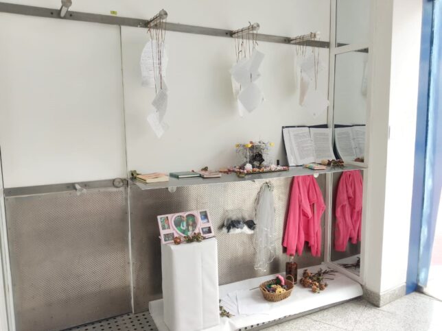 Al público que se acercó a ver su obra, Génesis Morales explicó que a través de ella quiso representar las necesidades de las personas de la tercera edad. Con el tiempo van perdiendo visión y ven borroso, lo cual mostró en una hoja cuyas letras eran ilegibles. Habló del uso de yerbas aromáticas, como la manzanilla, la cual ubicó tras una malla con un fondo negro. “Hablamos de una persona de 70 años o más”, mencionó, mientras levantaba una especie de delantal con manchas y deteriorado, señalándolo como la soledad, el descuido y el abandono que muchos adultos mayores reciben de sus familias.