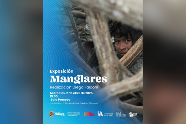La Sala Proceso de la Casa de la Cultura Núcleo del Azuay, en Cuenca, será este miércoles 2 de abril, a partir de las 19:00, el espacio expositivo donde se inaugure la muestra “Manglares”, del docente Diego Falconí Averhoff, de la Escuela de Cine de la Universidad de las Artes, producida por la también académica UArtes Priscilla Aguirre y el estudiante Juan Montenegro. En su contenido, la propuesta descubre la vida de los cangrejeros de Cerrito de los Morreños, una comunidad pesquera del Golfo de Guayaquil.