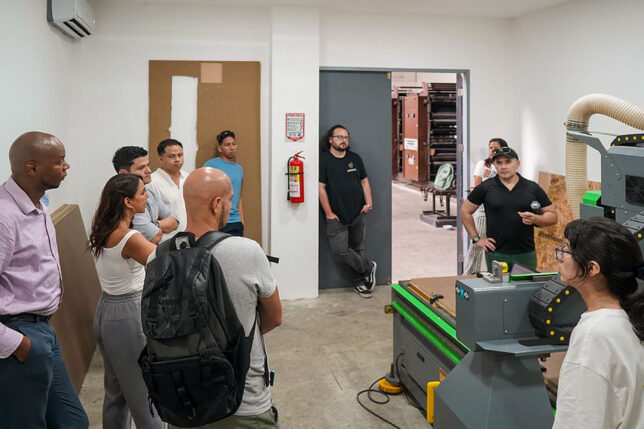 La capacitación tuvo tres jornadas y los funcionarios de la Universidad de las Artes que participaron pudieron conocer sobre el diseño y la fabricación de mobiliario modular, centrado en el usuario y aplicado al espacio público; se explicó el uso de equipos como la máquina CNC, esencial para el desarrollo de prototipos.