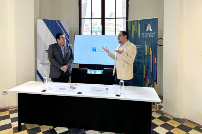 El doctor William Herrera, en su intervención y tras dar la bienvenida al procurador y su equipo de trabajo, indicó que la UArtes es una universidad pública dedicada especialmente a la formación de artistas que ya cumplió diez años de existencia, con varias promociones de graduadas y graduados en distintos campos y prácticas disciplinas artísticas; en su oferta académica, Artes Visuales. Producción Musical, Artes Musicales, Cine, Creación Teatral, Danza y Literatura, y una joven carrera de Educación Artística e Intercultural para formar a los futuros profesionales que se encargarán de la enseñanza artística en las escuelas y colegios.