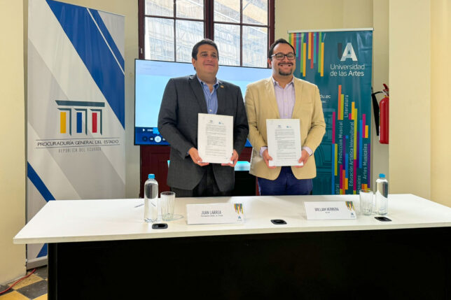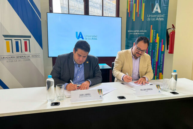 Un convenio marco de cooperación interinstitucional firmó la Universidad de las Artes con la Procuraduría General del Estado. El acto tuvo lugar el 25 de abril, en el Project Room del MZ14 Centro de Producción e Innovación UArtes; en la suscripción participaron nuestro rector, doctor William Herrera, y el procurador, abogado Juan Carlos Larrea.