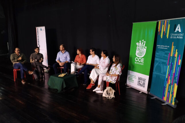 Con la moderación de Pablo Cardoso, director del Observatorio UArtes, y las participaciones de nuestro vicerrector académico, Bradley Hilgert, y del director de la CCE Núcleo de Manabí, Fidel Intriago, el diálogo tuvo como panelistas a Clara Mónica Zapata, de Medellín-Colombia, donde dirige la Corporación Banasta Mediaciones Arte y Cultura, y Pavel Villamar, artista escénico graduado en nuestra institución, quienes impartieron el taller “Tejiendo una canasta cultural manabita para el Siglo XXI”.