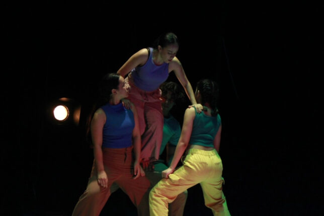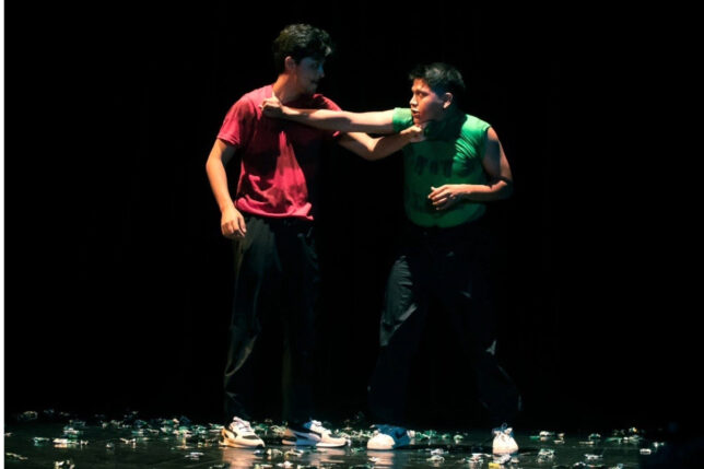 “En el laboratorio de lo absurdo, donde cada movimiento es un experimento y cada gesto, un misterio ¿a qué sabrá un caramelo?”, Christian Loor, su director, responde que esta pieza surge de una exploración de un conflicto en torno a un caramelo. “La idea vino a mí un día cualquiera, cuando estaba con mi sobrina pequeña comiendo dulces y solo quedaba uno, lo que desencadenó una interacción graciosa que me generó apetito creativo. A partir de ese momento, se construyó un imaginario que permitió establecer el universo en el que ocurre la coreografía: un laboratorio dirigido por un científico adicto a los dulces, que realiza pruebas y errores constantes con sus dos creaciones. De este modo, los dulces se convierten en los elementos que desencadenan los movimientos y las situaciones de la pieza”. La fotografía de “5×25 ctvos” es de David Grijalva.