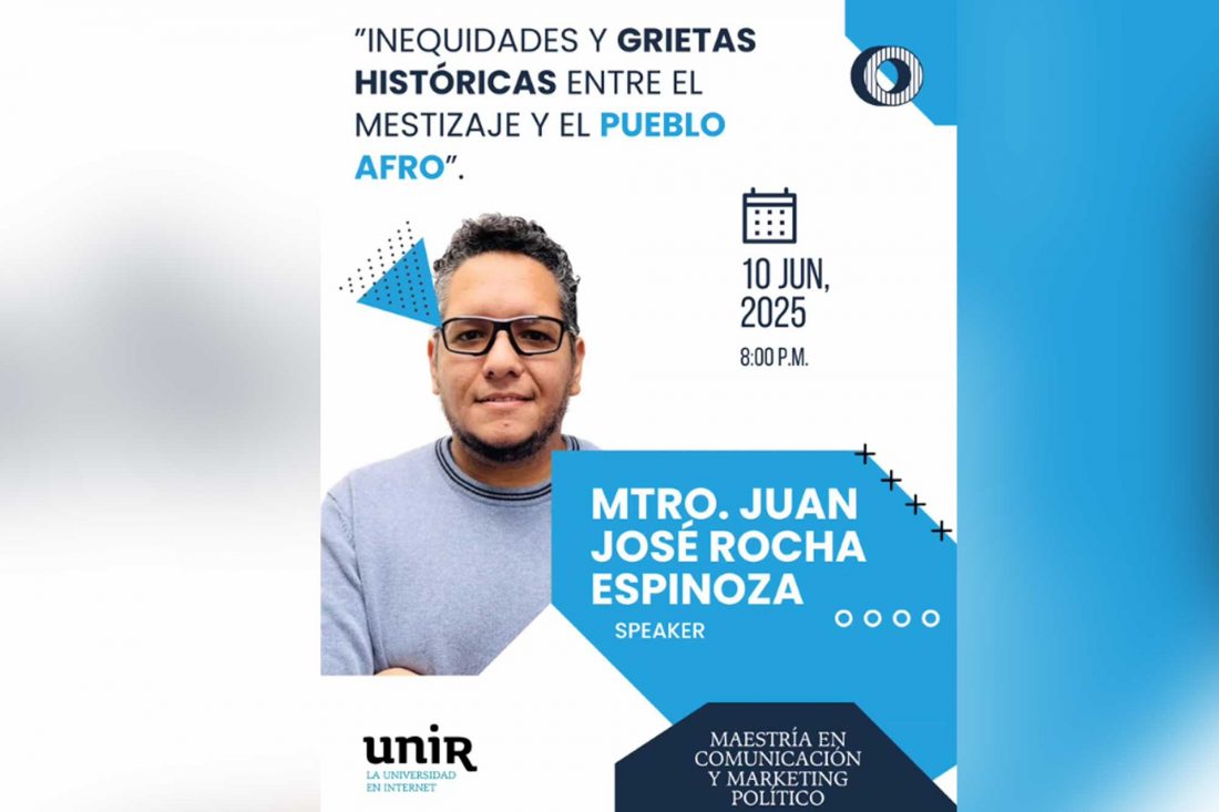 “Inequidades y grietas históricas entre el mestizaje y el pueblo afro”. Es el título de la conferencia que el magíster Juan José Rocha Espinoza, docente de la carrera de Educación Artística Intercultural de la Escuela de Literatura y director de Acompañamiento al Éxito Académico de la UArtes, dictó este martes 10 de junio a los estudiantes de la maestría en Comunicación y Marketing Político de la Universidad Internacional de La Rioja (UNIR), en México.