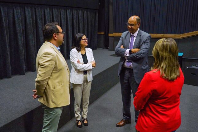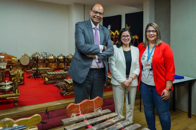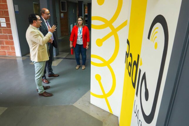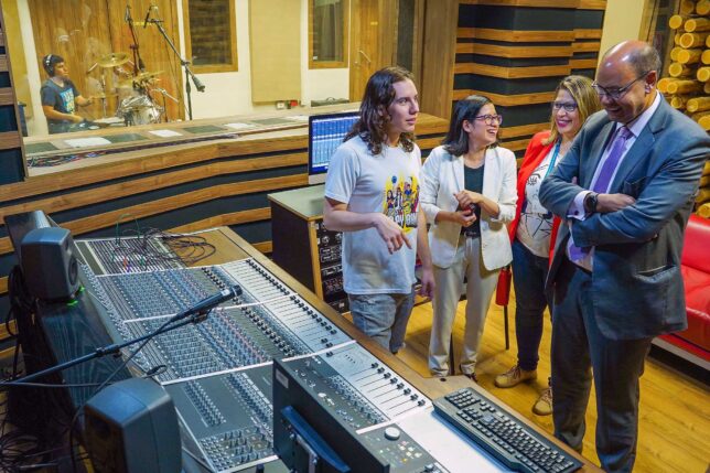 Las imágenes corresponden al recorrido que el embajador de Brasil, Flávio Damico, hizo con el rector William Herrera, la directora de Relaciones Internacionales, Susan Togra, y la docente UArtes de lengua portuguesa, Marcela Silva dos Santos, por el MZ14; conoció, entre otros, la radio, la sala de cine, los estudios de grabación y la sala de Etnomusicología, donde se encuentra el gamelán indonesio. Fotos: Tyrone Maridueña/Dircom.