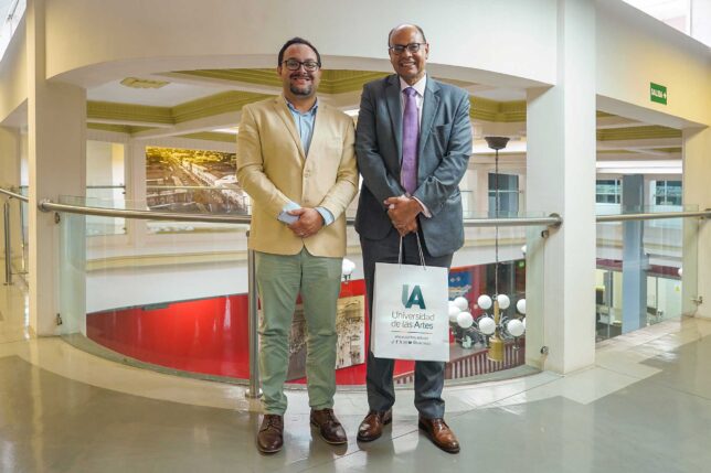 La Universidad de las Artes recibió la atenta visita del embajador de Brasil, Flávio Damico. Fue recibido en el MZ14 Centro de Producción e Innovación UArtes por nuestro rector, doctor William Herrera; la directora de Relaciones Internacionales, Susan Togra; y la docente de lengua portuguesa, Marcela Silva dos Santos, quien ha desarrollado una propuesta pedagógica innovadora que fusiona la enseñanza del portugués con prácticas artísticas y una perspectiva intercultural.