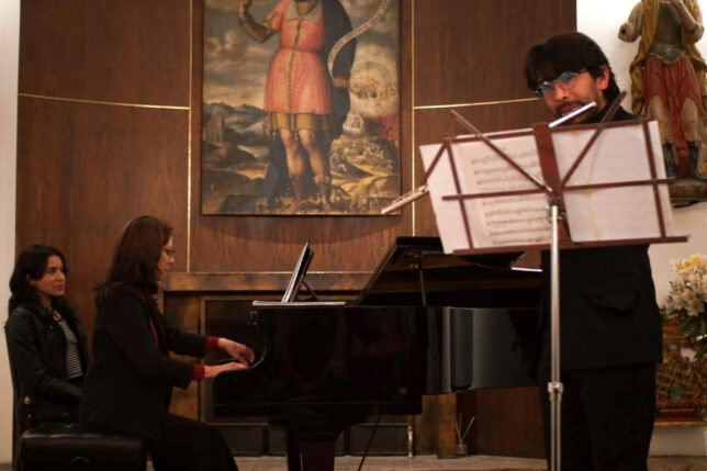 Los docentes Luis Carlos Moreno y Zoila Cevallos brindaron el martes 3, en Villa Celia, el recital “Mestizajes Sonoros: un viaje entre Colombia y Ecuador” y las composiciones interpretadas fueron: “Montañas e Islas encantadas”, de Blanca Layana; “Patallucha, de Jamil Erazo; “Escondida en las pupilas”, de Leonardo Cárdenas; “Recuerdos”, de Ferney Lucero; y “Fantasía para flauta y piano”, de Diego Monsalve Folleco.