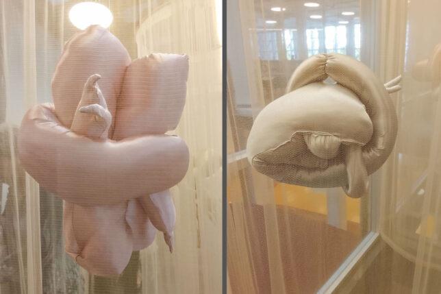 De entre las obras de Erika Cárdenas destacó “Habitáculo”, una instalación de cinco estructuras suspendidas que evocaron vestidores circulares del fast fashion, pero sin cortinas: los cuerpos expuestos se mantuvieron en constante transformación. “Quise mostrar la performatividad de la feminidad, sin ocultar el proceso”, dijo la artista.