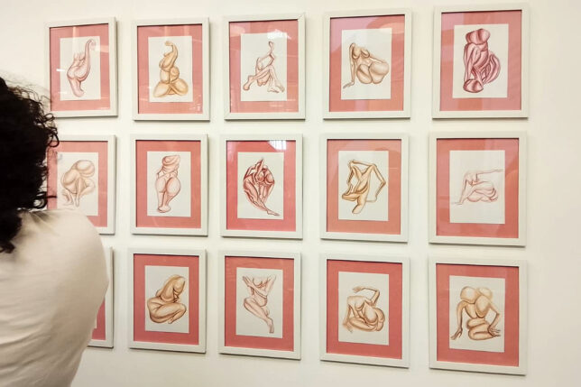 La muestra incluyó pinturas al óleo y una serie de quince acuarelas. Mientras que en el lienzo los cuerpos se funden en una masa unificada –desplazando el rosa al fondo para destacar la piel–, en las acuarelas cada figura conservó su individualidad y proceso de cambio. “No soy la misma de hace cinco años; esta serie habla de esa transformación constante”, explicó.