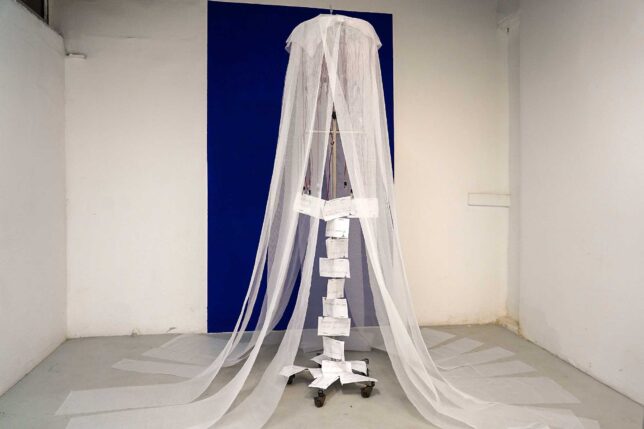 Como “Un mal sueño” tituló Paula Loza a su propuesta, para lo cual utilizó un aro de metal, alambres en forma de tejido de atrapasueños, una tela de toldo blanca, un portasuero metálico, equipo de venoclisis, agujas hipodérmicas, líquido teñido con colorante rojo, reproducciones de recetas médicas e hilo blanco. En su descripción, la estudiante detalló que la instalación revelaba el miedo a la vulnerabilidad impuesto por la enfermedad frente a la posibilidad de la muerte y el deseo de que todo sea un mal sueño.