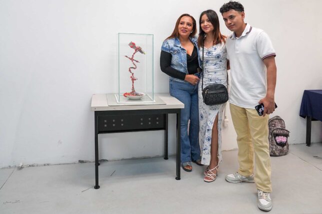 Otra de las obras expuestas fue “Nunca más”, de la autoría de Ana Zambrano, quien con cinta de embalaje y en técnica/medio escultura, quiso compartir con el público que la mejor forma de avanzar es empoderándose y romper ese cascarón que nos limita. “(…) dejar atrás las órdenes de mi familia que limitaban mi tiempo. Hoy he comenzado a avanzar y a emprender el vuelo”, anota la alumna de Nivelación, de la materia Prácticas Disciplinar.