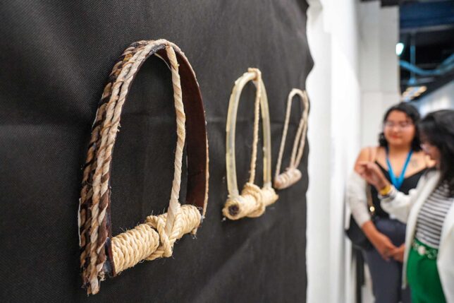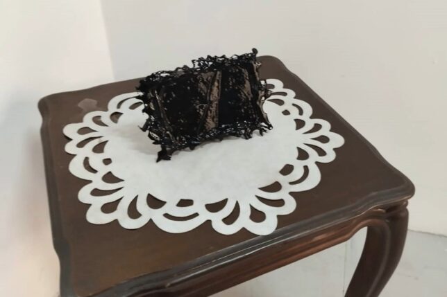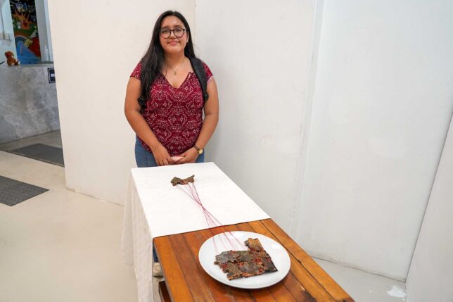 “La presencia de la ausencia”, de Sofia Plaza, quien, para su elaboración y en una técnica de ensamblaje, reutilizó madera de casa de árbol, corteza de árbol de mango e hilos rojos con los que reflexionó sobre los lazos que permanecen a pesar de la distancia. Materiales cargados de memoria que entablaron un diálogo entre lo que se pierde y lo que permanece, indicó en la descripción, indicando haber trabajado incluso la mesa que sostuvo su propuesta. “La madera y la corteza se convierten en fragmentos de recuerdos que forman un rompecabezas que representa a la familia con piezas parecidas, no idénticas, pero capaces de encajar entre sí y construir un todo”.