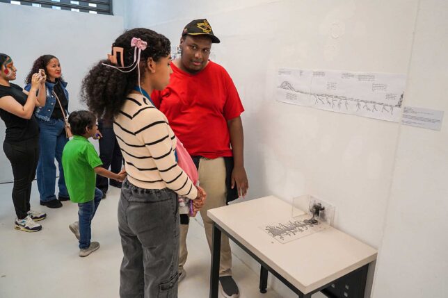 De la autoría de Michael Vega, en El Garage se pudo observar “Tata”, una obra trabajada en goma, maicena, cochinillas (plaga de plantas), accesorios de maquillaje de Tata y cinta de hospital que esculpida como un retrato dedicó a Sandra Freire, quien enfrentó un cáncer en el duodeno, el cual se hizo metástasis y terminó con su vida en febrero del 2025. Así lo señaló en la descripción su autora, sosteniendo que la enfermedad catastrófica no consumió las semillas de amor que dejó sembradas en cada alma que tuvo la dicha de conocerla.