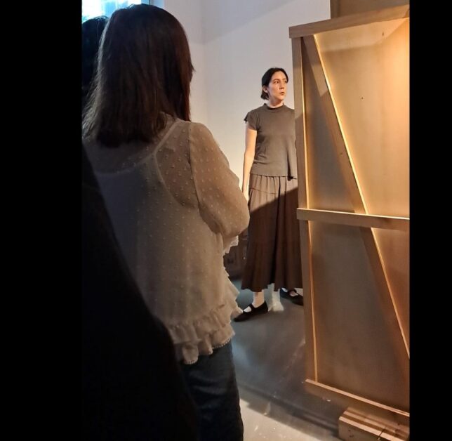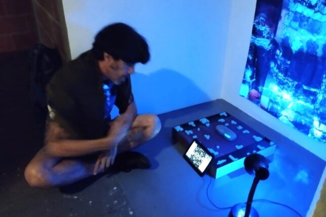Mariví Suárez: “Confesionario (Primera fase: display de procesos)”. La obra es un habitáculo de pino que requiere de la performatividad para el despliegue de los pecados. Es un espacio de apertura controlada, donde las intimidades se comunican al Cosmos en busca de absolución. Actúa como un puente semántico entre lo terrenal y lo cosmológico, entre lo individual y lo colectivo-globalizado. La propuesta piensa sobre la personalización de los espacios íntimos y cómo las dinámicas de consumo capitalista han penetrado en ellos, afectando nuestra capacidad de transformar la realidad. Propone una reflexión sobre nuestros espacios domésticos cuando estos albergan una línea directa con herramientas de colectivización. ¿Cómo cambia un cuarto cuando tiene una computadora con internet adentro? y cómo se organizan los objetos que orbitan en torno a ese portal digital.