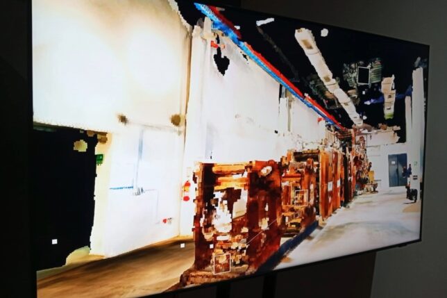 Enrique Landívar: “Magna Sceletus S1. Pointcloud audioreactivo de escaneo 3D. Render equirectangular 8K para realidad virtual”. La rotativa King Press, un cuerpo oxidado del año 1987, es una máquina de imprenta hoy obsoleta que perteneció al antiguo diario El Telégrafo. Mediante escaneo 3D y realidad virtual, se activó una simulación del interior de la sala de La Rotativa, donde los ojos del espectador navegaron en cámaras virtuales que orbitan alrededor de la máquina, moviéndose entre partículas audio-reactivas que responden a un paisaje sonoro de engranajes con un estilo de ruido blanco industrial.