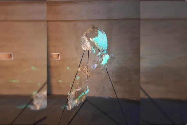 Andrea Moreira: “El panal”, instalación con malla hexagonal y video mapeado. Forma parte de Sur’hae como contenedor y estructura viva compuesta por módulos hexagonales que, al ser mapeados con video abstracto, revelan destellos de un ecosistema interior. Las proyecciones no representan una mirada humana, sino que simulan una percepción más–que–humana: fragmentada, acelerada y abstracta. No buscan ser comprendidas desde el ojo humano, sino provocar un estado de sintonía sensorial, donde el color predominante, el ritmo y la abstracción construyen una narrativa no verbal.