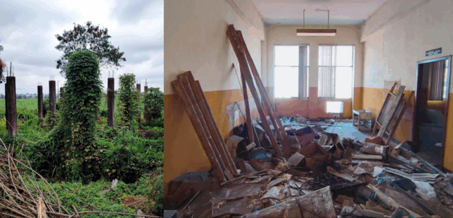 “Fragmentos”: es una pieza pictórico-escultórica construida a partir de materiales encontrados que evocan lo anómalo y lo tangible de estos espacios abandonados. “Considero que, al colocarla en la pared, busco crear la ilusión de una arquitectura que colapsa, se fractura y conserva sus heridas a la vista. Sobre esta superficie corroída intervengo con patrones cromáticos que aluden a las mismas imágenes médicas que he venido estudiando. Estas zonas de color no son decorativas: funcionan como focos de atención, como si estuvieran revelando y sectorizando anomalías”.
