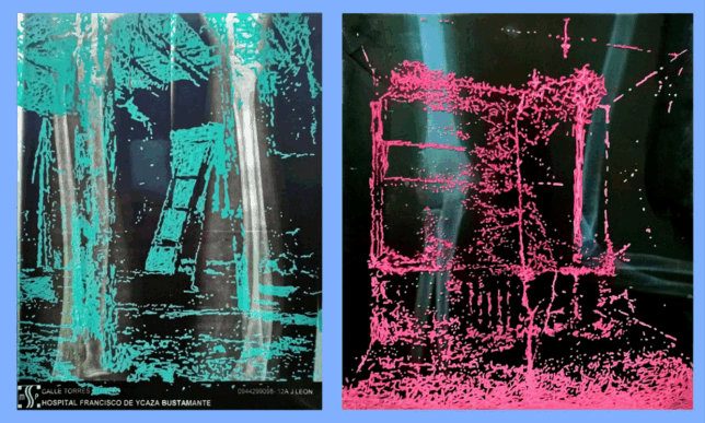 “Espacios Traslúcidos”: “En este caso, decidí trabajar directamente sobre placas de radiografías (material diseñado para revelar lo que esta oculto dentro del cuerpo); lo uso como soporte pictórico y simbólico. Me interesa cómo este medio, que normalmente se asocia con el diagnóstico médico, puede ser resignificado para hablar de los espacios urbanos en decadencia. Al pintar y dibujar sobre las radiografías siento que se establece un diálogo íntimo entre lo corporal y lo arquitectónico”.