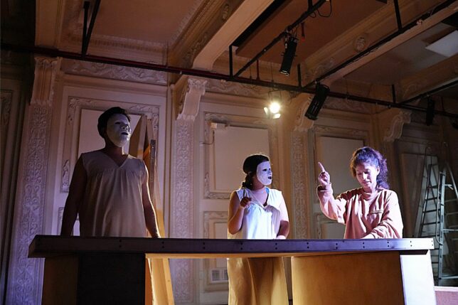 Reconoció que no tenía una historia como una cronología lineal, sino fragmentada y en su concepción la obra a realizar era más un trabajo del cuerpo. De allí que pensó en que los intérpretes utilizaran máscaras porque más allá de decir si es hombre o mujer, se trata del cuerpo. “Es una dramaturgia contemporánea que se acerca a lo experimental; jugamos con las voces, el coro, las luces, tenemos videomapping, música en vivo. Es sumamente interdisciplinar y por ello integran el elenco estudiantes y graduados de varias escuelas”.