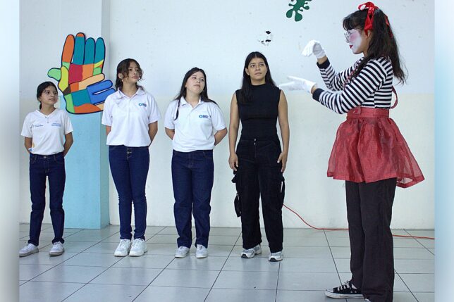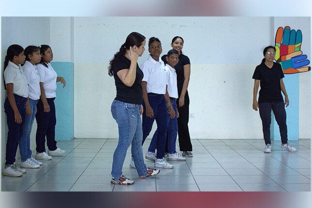 Germania Olvera, carrera de Danza: “Fue un honor poder aprender y haber sido parte de este momento muy especial, poder disfrutar con ellos riendo, bailar tanto como los niños y los docentes, fue una experiencia muy bonita; ver cómo otras formas de comunicación nos hacen más unidos y más sensibles. Quedan momentos inolvidables en mí de lo que se pudo compartir ese día”.