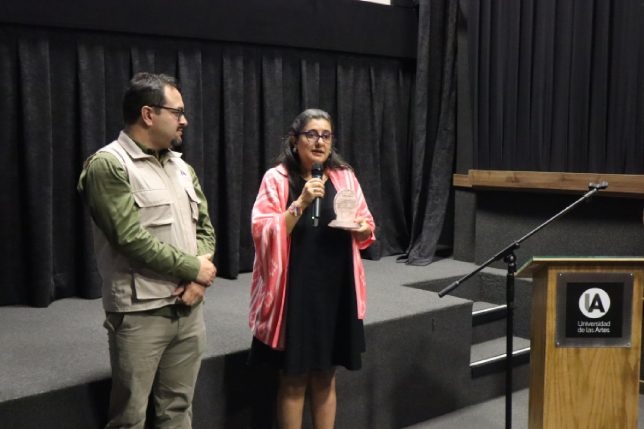 El rector expresó igualmente agradecimiento a María José Icaza por la labor desempeñada durante los diez años que estuvo a cargo de la Dirección de Vinculación con la Comunidad. Lo hizo con una placa, en cuyo texto se destaca su valioso liderazgo y compromiso con las comunidades, el ejercicio de los derechos culturales y la educación pública en artes. Contó que la presea fue elaborada en el Fab.Lab. de la UArtes por las estudiantes Carolina Narváez y Elizabeth Estupiñán, el administrativo James Pacheco y el artista y docente Cristian Villavicencio, director de la Escuela de Posgrados.