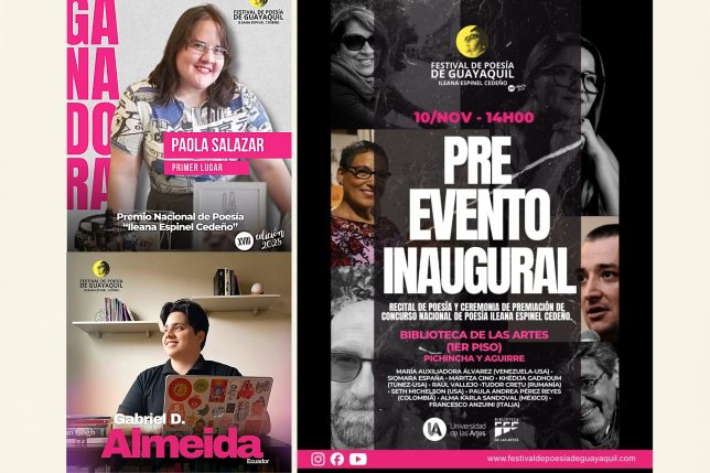 También el lunes 10 de noviembre se entregarán los reconocimientos del Concurso de Poesía Ileana Espinel Cedeño, del cual Paola Salazar, estudiante de la carrera de Literatura de la UArtes, ganó el premio nacional.
