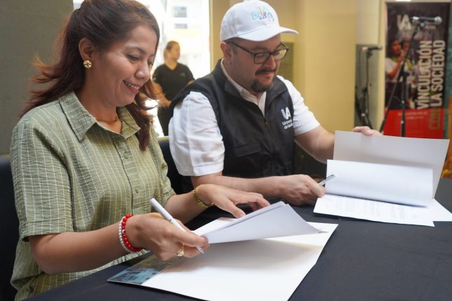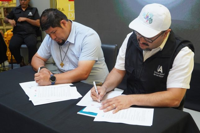 El rector firmó en el acto de cierre de la segunda fase de la Escuela de las Artes varios convenios de cooperación interinstitucional con representantes de la Fundación Proyecto Salesiano Guayaquil (FPSG), padre Fausto Siavichay; el Instituto de Seguridad Social de las Fuerzas Armadas (ISSFA), Cap. Leonardo Aguirre; el GAD Parroquial La Victoria, Mtr. Iliana Mora; y el GAD Municipal Marcelino Maridueña, Dra. Gloria Mancero.