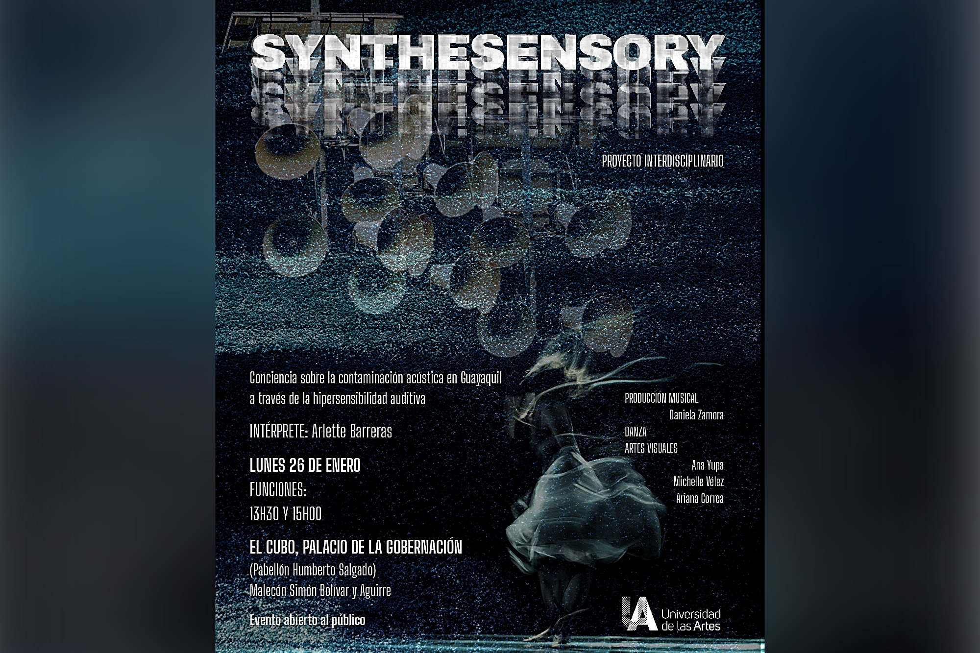 Estudiantes de Artes Visuales, Artes Sonoras y Artes Escénicas presentarán este lunes 26 de enero, en dos funciones, los resultados de un proyecto al que titularon “Synthesensory” y concibieron para crear conciencia sobre la contaminación acústica en Guayaquil, especialmente en el centro de la urbe, a través de la hipersensibilidad auditiva.