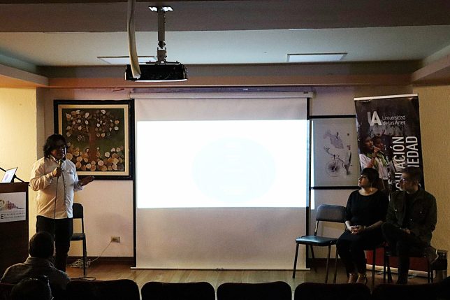 Patricio Sánchez compartió su experiencia como docente de la asignatura de Laboratorio de la Comunidad en los sectores de Isla Trinitaria y el suburbio Oeste de Guayaquil, donde ha trabajado esta sistematización de cómo las prácticas y los lenguajes artísticos del cine y de las artes sonoras, escénicas y visuales pueden lograr una dinamización y movilización de la comunidad, a partir de las relaciones que se retoman entre familias, miembros de la comunidad, del barrio y del territorio.
