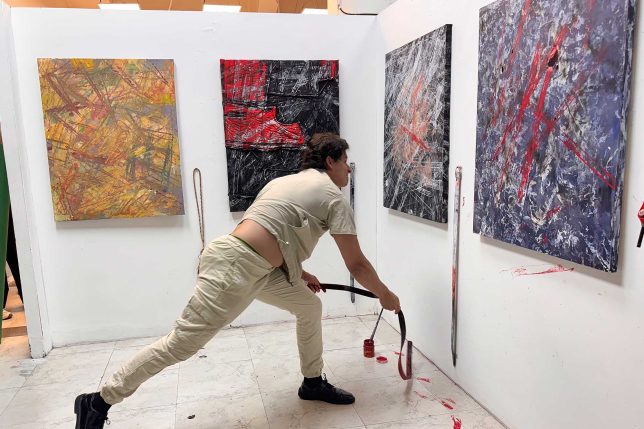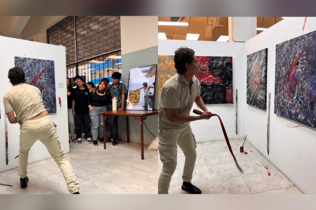 En otra muestra colectiva –igualmente de fin de semestre, de la asignatura “Exploraciones de Poéticas Pictóricas II”, titulada “El gesto del cuidado e inaugurada en el Taller de Pintura (primer piso del edificio Tábara)–, Reimon Mendoza presentó un videoarte y una performance de su proceso creativo. Para lo segundo, el artista estudiante llevó pintura, correas con sus respectivas hebillas y un látigo de cuero de vaca y una pata de conejo colgando.