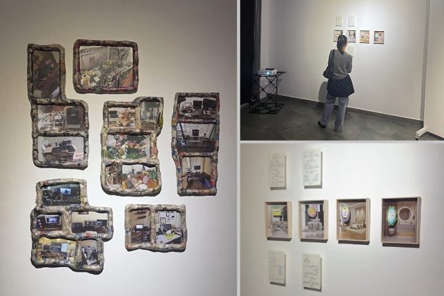“Rituales de desencantamiento” se encuentra en la Galería CIF del MZ14 Centro de Producción e Innovación, que es uno de los cuatro escenarios de la muestra de titulación. Componen la propuesta expositiva de Mariví Suárez las piezas: “El confesionario” (2025), un mueble de pino con reclinatorio de cartón; “La cuidad es un escritorio, es un retrato” (2025-2026), que en dimensiones variables recoge fotos de escritorios impresas en papel con marcos de periódico; y “Momoore drag” (2025), un video-proyección de 5′.