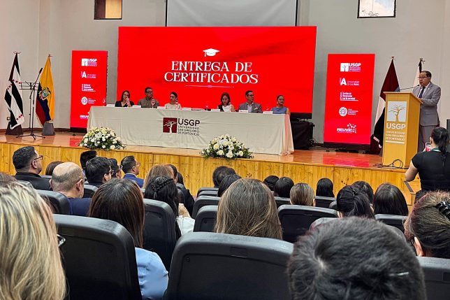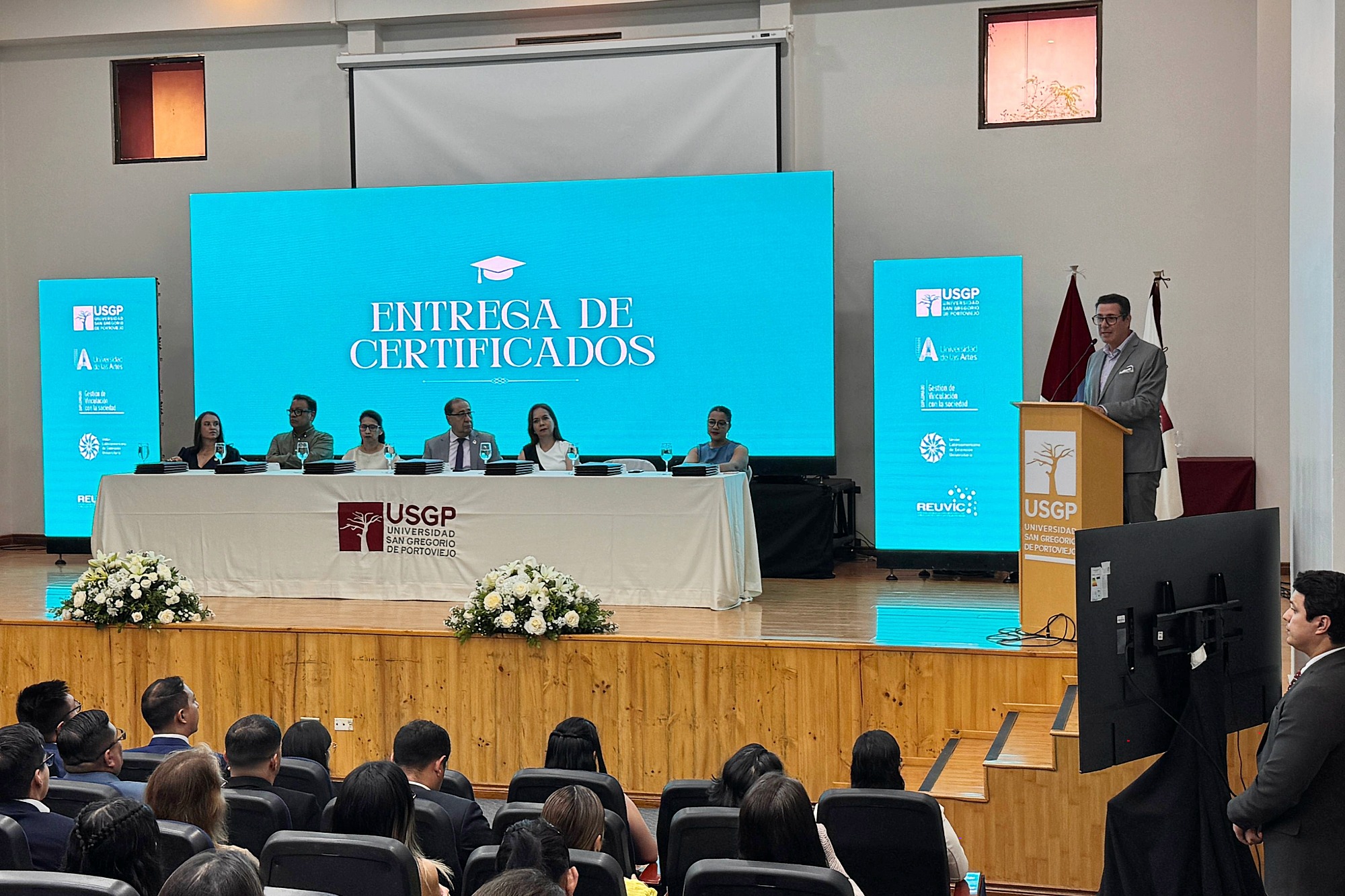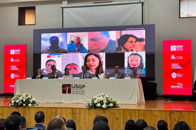 En la mesa directiva los acompañaron: también por la UArtes, el vicerrector de Posgrados e Investigación en Artes, doctor Andrey Astaiza. Por la USGP, los Dres. Ximena Guillén, canciller; Eco. Katty Loor, vicerrectora académica; y Tania Zambrano, directora general académica y coordinadora pedagógica del diplomado. Y en representación de la Reuvic su presidenta, Dra. Ana Santos.