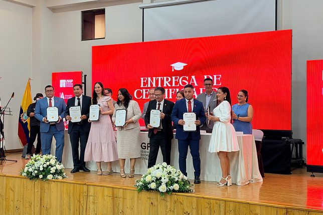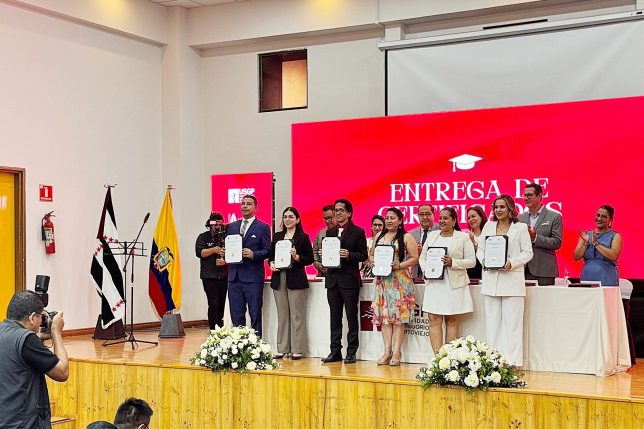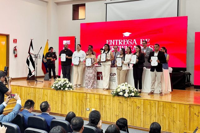 Treinta y uno de los más de 120 estudiantes que cursaron el diplomado recibieron el certificado; hubo funcionarios de catorce instituciones de educación superior de varias ciudades. De la UArtes concluyeron el programa de estudios: Gilda Sánchez, Pedro Mujica, Mario Maquilón, Nikita Félix Galarza y Juan Carlos Vargas. La entrega del certificado se realizó en un emotivo acto que tuvo lugar el viernes 27 de marzo en el auditorio de la USGP y fue presidido por los doctores Saidel Brito y Jaime Alarcón, rectores de la Universidad de las Artes y la institución manabita, respectivamente.