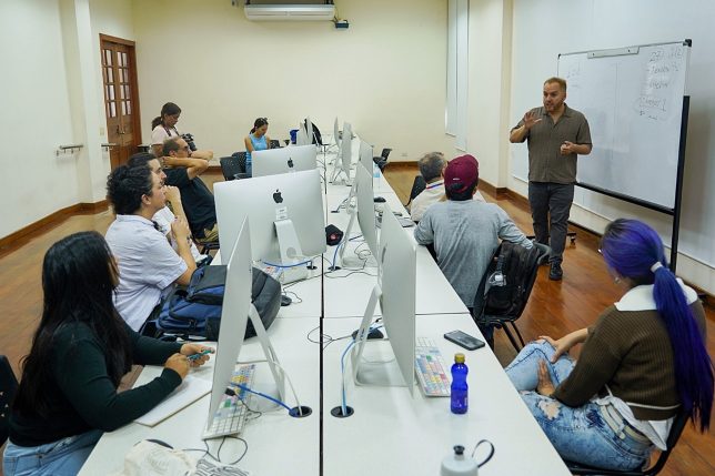 De las materias vistas en las sesiones presenciales, la coordinadora de la maestría indicó que el “Taller de investigación escritura y realización” que dicta la cineasta Alexandra Cuesta es esencial porque es donde los estudiantes empiezan a crear su película documental. Es una clase que se enfoca mucho en el proceso de creación, desde la escritura o la escritura con la cámara, y en la realización de rodaje de filmación y registro de su material.