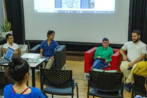 Es jueves 17 de julio y en la Biblioteca de las Artes se desarrolla la mesa de diálogo “Memorias corporales, afectos y escritura”, en el marco de la V edición de Inter[•]actos. Participan: Cristina Cardona, Germán Palomo y Cristian Euvin, acompañados por la docente Paulina Briones y la escritora Natalia García Freire. La propuesta de la cita es que se puedan compartir criterios que nutran los procesos creativos de los estudiantes de la maestría de Escritura Creativa UArtes.