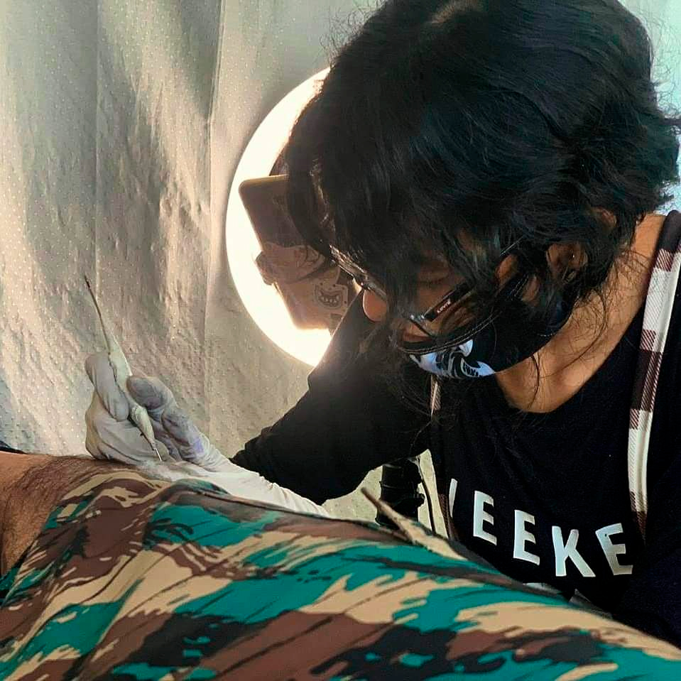 Mi nombre es Mariuxi Bermeo y soy estudiante de la Escuela de Artes Visuales de la Universidad de las Artes y mi emprendimiento SOMOS (que es más bien mi seudónimo) es un trabajo freelance en el que a través de la técnica handpoke que es una práctica que ocupa los mismos materiales seguros y estériles que se usa en el tatuaje a máquina, con la diferencia que los tatuajes a mano son menos agresivos con la piel, en general son menos dolorosos, se inflaman mucho menos y sanan más rápido que los tatuajes hechos a máquina.