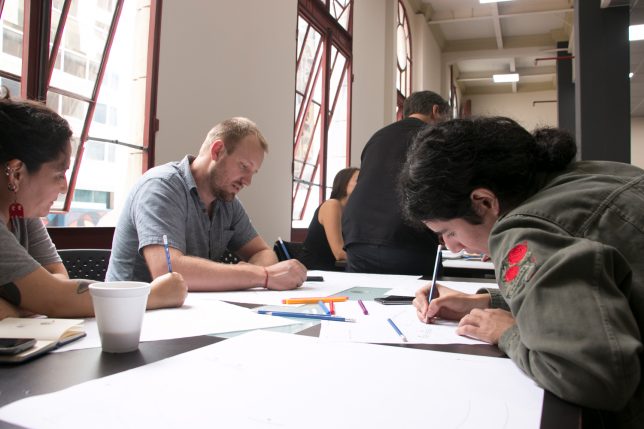 “Iconoclasistas”, taller de ocho horas dictado por un grupo homónimo proveniente de Argentina, dirigió las dos jornadas en las que estuvo dividido –también se realizó hoy, martes 9 de julio– a generar un espacio de formación y activación de herramientas visuales para la investigación colaborativa y territorial. En un panel gráfico se realizó el bocetado de un proyecto que abordó las dimensiones espaciales, temporales, corporales y de paisaje, a partir de las selecciones temáticas realizadas por cada participante.