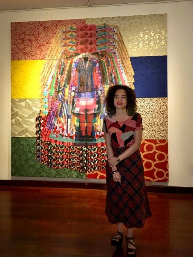 La obra con la que ganó Diana Gardeneira es una composición digital de 60 piezas de ropa femenina impresas en lienzo y luego sobrepuestas e intervenidas con acrílico y pintura textil.