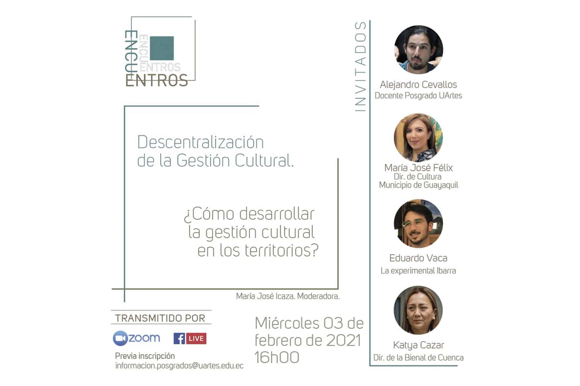 Con el tema “Descentralización de la Gestión Cultural. ¿Cómo desarrollar la gestión cultural en los territorios?”, el programa “Encuentros” que impulsa la Maestría de Políticas Culturales y Gestión de las Artes de la Universidad de las Artes llega este miércoles 3 de febrero de 2021 a su cuarta sesión. Se desarrollará a las 16h00, a través de la plataforma Zoom, y se transmitirá por las redes sociales de la UArtes y la Escuela de Posgrados.