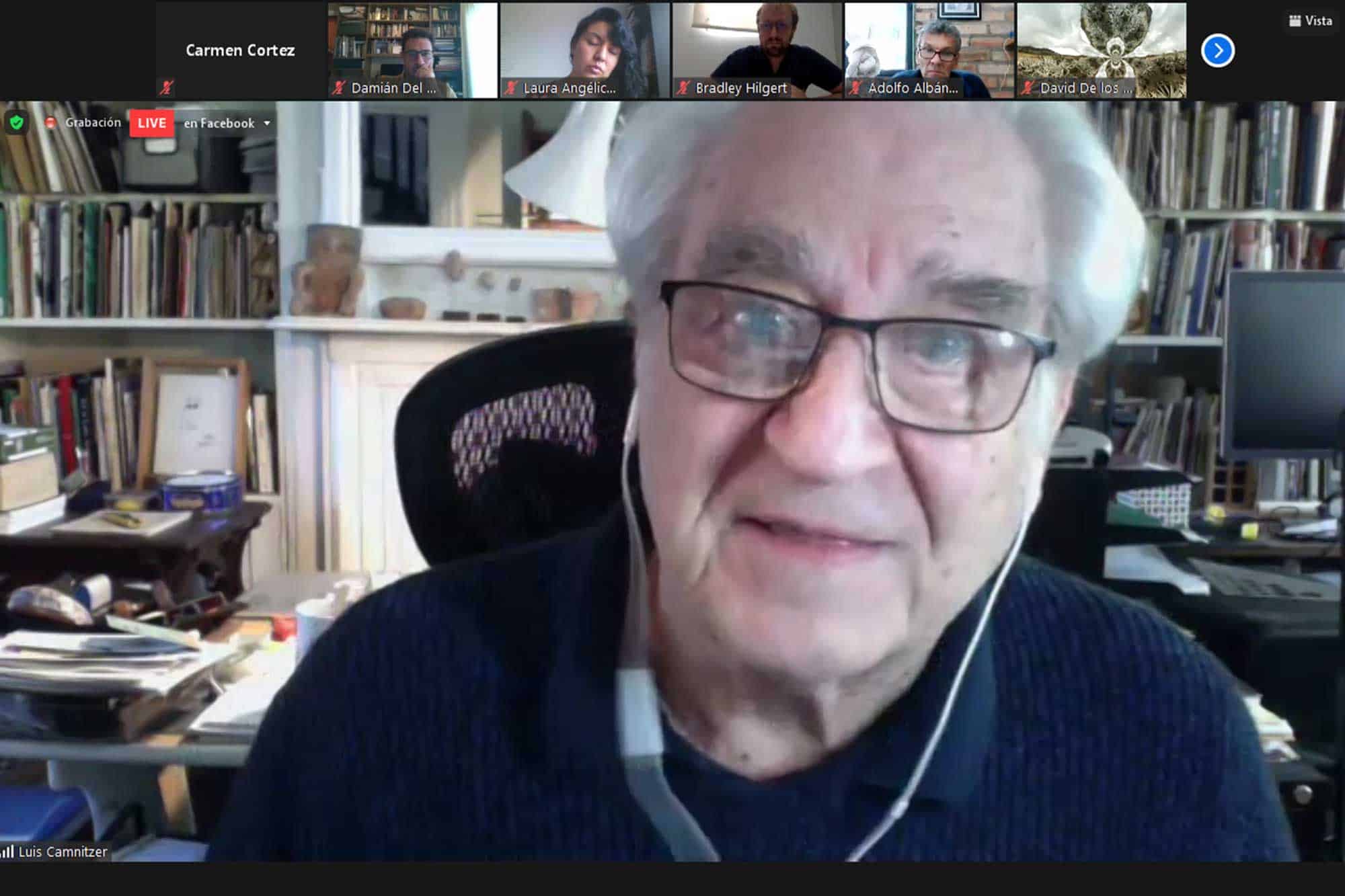Artista alemán-uruguayo, cuyo trabajo es destacado y reconocido tanto en lo artístico como por sus ideas en cuanto a la enseñanza del mismo. Luis Camnitzer participó junto a otros tres invitados internacionales –Adolfo Albán Damián del Valle y Fabián Cabaluz– en la mesa redonda convocada por el Vicerrectorado Académico de la Universidad de las Artes el 26 de abril de 2021 para analizar la construcción de un modelo educativo y pedagógico. El maestro tuvo importantes reflexiones sobre los cambios que se necesitan para modificar los paradigmas de la pedagogía en artes. Comentando la terrible situación que afronta el mundo por COVID-19, explicó cómo la pandemia lo llevó a cambiar su perspectiva, tomando consciencia sobre lo privilegiados que nos encontramos muchos al contar con una computadora que nos permite adaptarnos a esta “nueva realidad”.