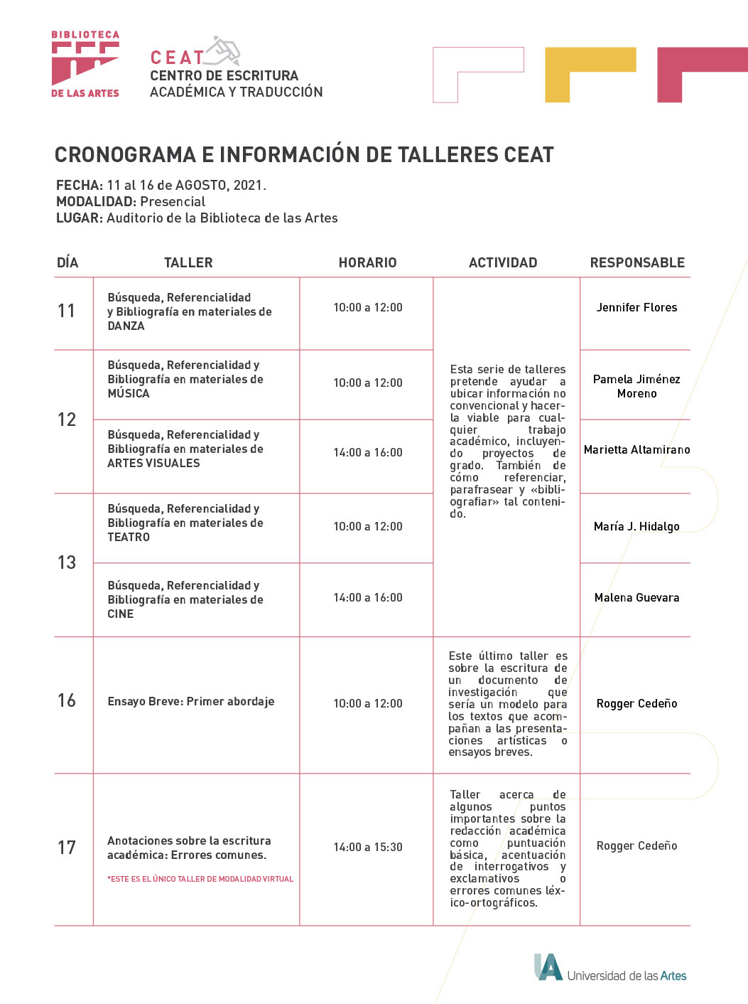 El CEAT (Centro de Escritura Académica y Traducción) realizará, en colaboración con la Biblioteca de las Artes, talleres dirigidos a la comunidad universitaria desde el miércoles 11 hasta al martes 17 de agosto de 2021.