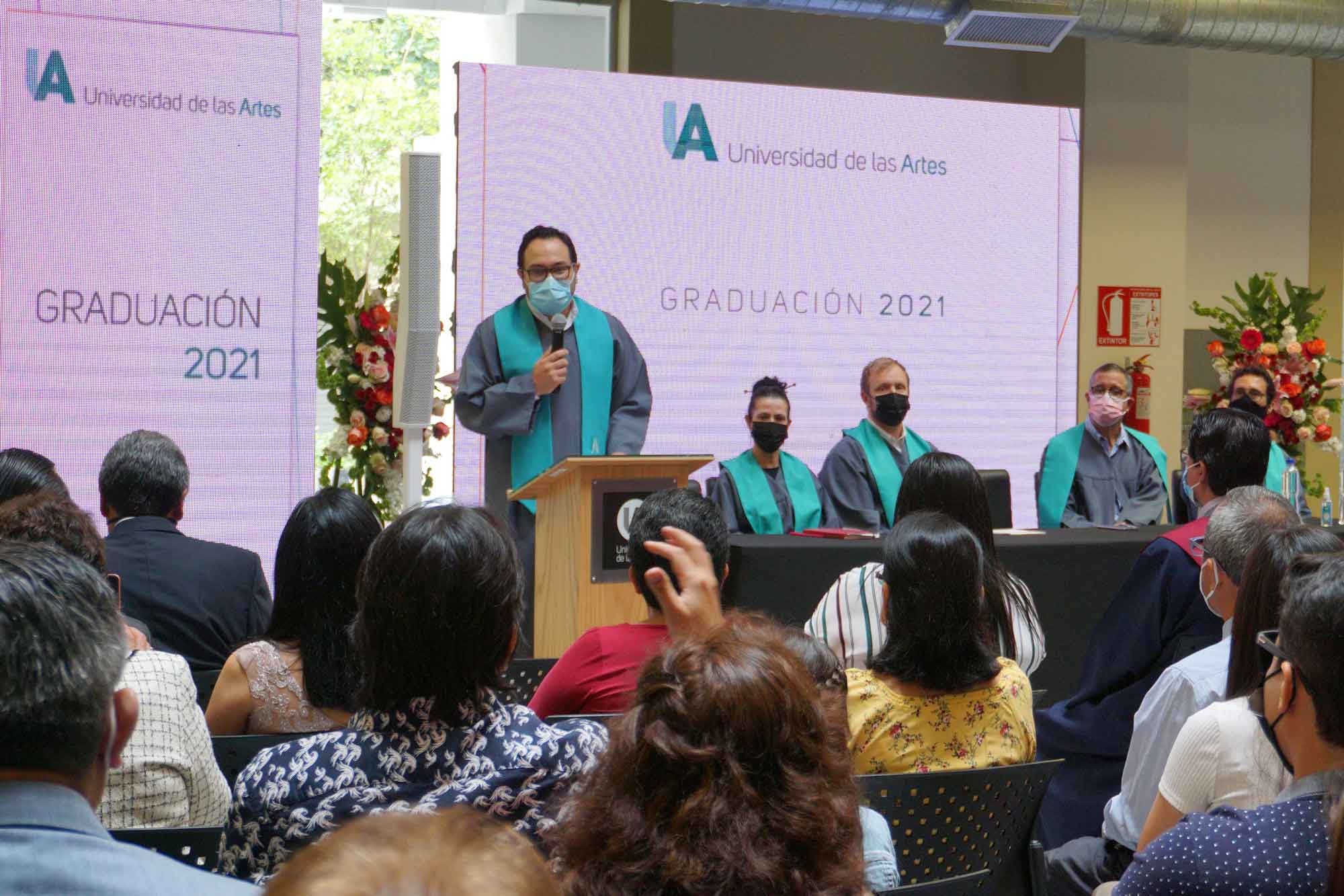 Muchos de los estudiantes de la promoción 2021 iniciaron sus estudios en el primer semestre 2017, o en el segundo semestre 2016, y si tomaron un poco más de tiempo para sus proyectos de titulación, quizás en el primer semestre del 2016. “Es decir, ustedes son de una generación que ha tenido que enfrentar muchos desafíos. El país ha pasado por dos cambios de gobierno, de Rafael Correa a Lenin Moreno y de Lenin Moreno a Guillermo Lasso; enfrentamos juntos las protestas de octubre del 2019, que nos golpeó directamente al encontrarnos con la violencia y la represión, y tuvieron que enfrentar y terminar sus estudios en el contexto de la pandemia. Ustedes, al terminar sus estudios, han demostrado una gran capacidad de resistencia y resiliencia. Nunca renunciaron a ejercer su pensamiento crítico, su deseo de experimentar, de desarrollar nuevos lenguajes en situaciones extremadamente adversas”.