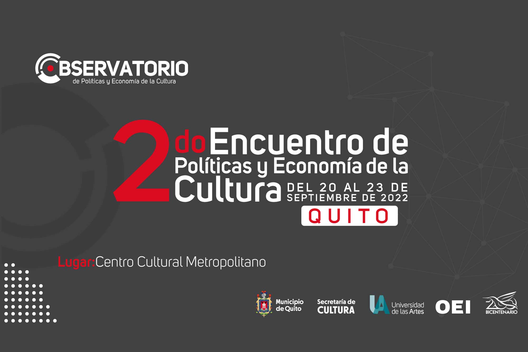 Del 20 al 23 de septiembre próximo tendrá lugar en el Centro Cultural Metropolitano de Quito el 2do Encuentro de Políticas y Economía de la Cultura, organizado de manera conjunta por el Observatorio del Instituto Latinoamericano de Investigación en Artes de la UArtes y la Secretaría de Cultura de la capital ecuatoriana.